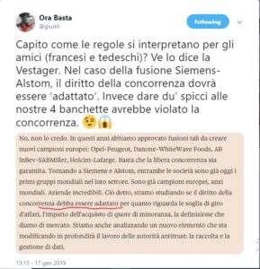 L’invito formulato nell’editoriale del Financial Times è piuttosto chiaro: la Vestager non deve cedere alle pressioni dei governi nazionali e deve difendere le regole antitrust. Autorizzare un accordo del genere sarebbe un clamoroso caso di prevalenza degli interessi nazionali sulle regole della concorrenza. I toni usati sono piuttosto duri: si passa dall’esplicito sospetto di applicare le regole in relazione alla nazionalità delle imprese coinvolte, si continua col rischio di perdita di credibilità e si termina con l’accusa di ipocrisia in caso si ceda alle pressioni dei governi nazionali.